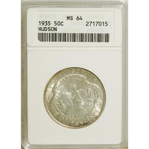 <B>1935 50C Hudson MS64 ANACS.</B></I> Pleasingly lustrous with typically pillowy detail at the centers. Soft pearl-gray toning prevails on each side, though the margins show hints of gold and rose. Minor, scattered flaws preclude a Gem designation.<BR><BR><b>Shipping:</b> Coins & Currency (<a target="_blank" href="http://www.heritageauctions.com/common/shipping.php">view shipping information</a>)