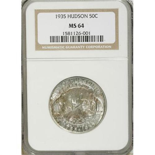 <B>1935 50C Hudson MS64 NGC.</B></I> Autumn-brown and olive-green shades enrich the obverse center and the reverse margin. This shimmering near-Gem is refreshingly free from marks. A much better commemorative type.<BR><BR><b>Shipping:</b> Coins & Currency (<a target="_blank" href="http://www.heritageauctions.com/common/shipping.php">view shipping information</a>)