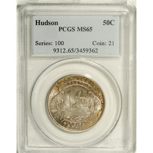 <B>1935 50C Hudson MS65 PCGS.</B></I> Speckles of reddish-gold gravitate to the borders of this lustrous Hudson commemorative half dollar. A sharp, even strike has imparted excellent detail to the devices, further enhancing the coin's eye appeal. A few inoffensive reverse marks are all that stand in the way of a higher grade designation.<BR><BR><b>Shipping:</b> Coins & Currency (<a target="_blank" href="http://www.heritageauctions.com/common/shipping.php">view shipping information</a>)
