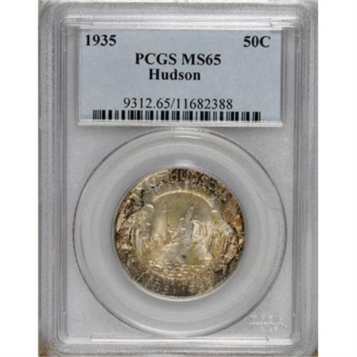 <B>1935 50C Hudson MS65 PCGS.</B></I> Splotches of purple, golden-tan, and russet concentrate at the periphery of this Gem commemorative. Well preserved surfaces display strong luster and well impressed design elements. This coin marked the 150th anniversary of the founding of Hudson, New York, a small city on the east bank of the Hudson River, about 40 miles south of Albany.<BR><BR><b>Shipping:</b> Coins & Currency (<a target="_blank" href="http://www.heritageauctions.com/common/shipping.php">view shipping information</a>)