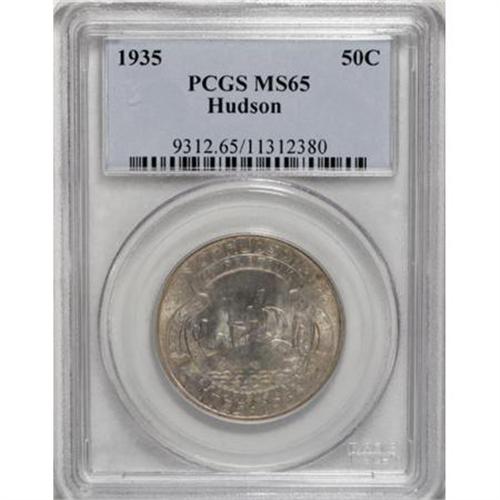 <B>1935 50C Hudson MS65 PCGS.</B></I> A touch of softness on the central devices is typical for this low-mintage classic commemorative. Both sides of this luminous Gem exhibit rose, gold, and violet patina of varying thickness.<BR><BR><b>Shipping:</b> Coins & Currency (<a target="_blank" href="http://www.heritageauctions.com/common/shipping.php">view shipping information</a>)