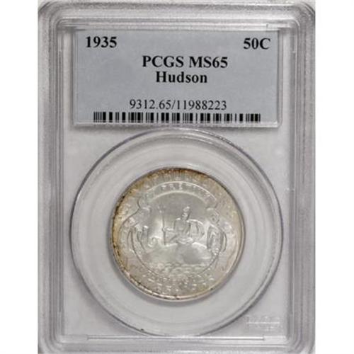 <B>1935 50C Hudson MS65 PCGS.</B></I> Light gold patina accented with wisps of deeper gold-purple concentrates at the margins of this Gem that commemorates this small Hudson River city that is 40 or so miles south of Albany. Well preserved lustrous surfaces are well struck.<BR><I>From The John Stimson, Sr. Collection, Part Two.</B></I><BR><BR><b>Shipping:</b> Coins & Currency (<a target="_blank" href="http://www.heritageauctions.com/common/shipping.php">view shipping information</a>)