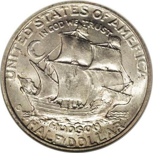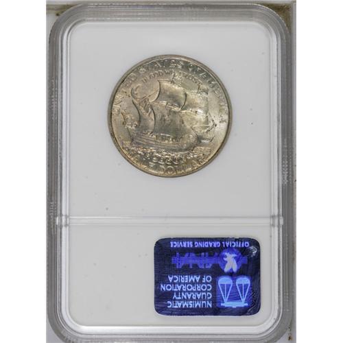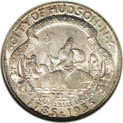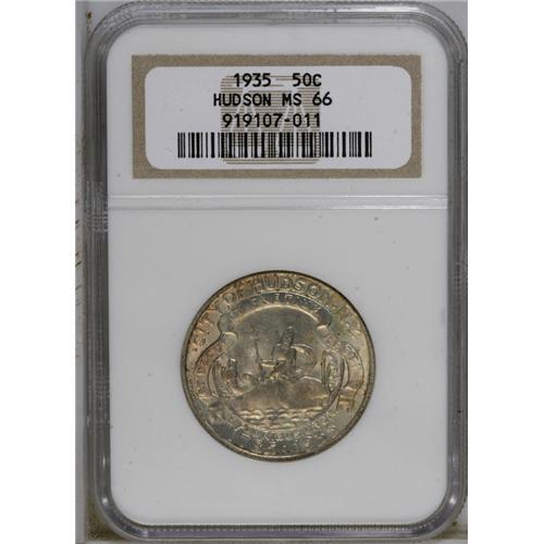 <B>1935<50C> Hudson MS66 NGC.</B></I> Along with the Old Spanish Trail, the Hawaiian, the Missouri 2x4, and Monroe issues, the Hudson is a well-established key in higher Mint State grades to the silver commemorative half dollar series. This pleasing example offers light silver-gold surfaces with a glint of jade on the obverse.