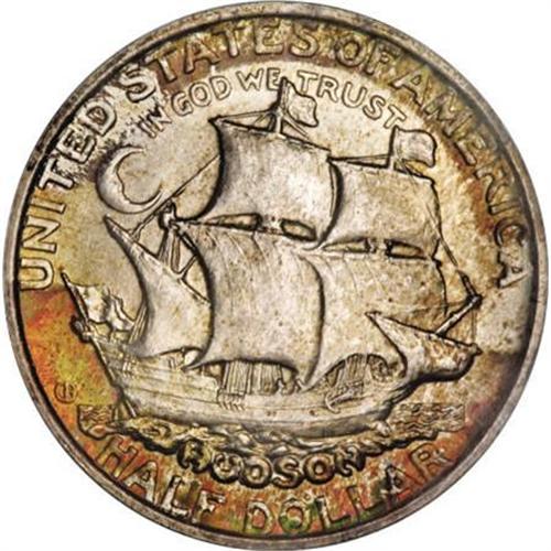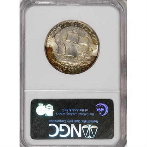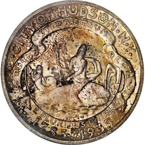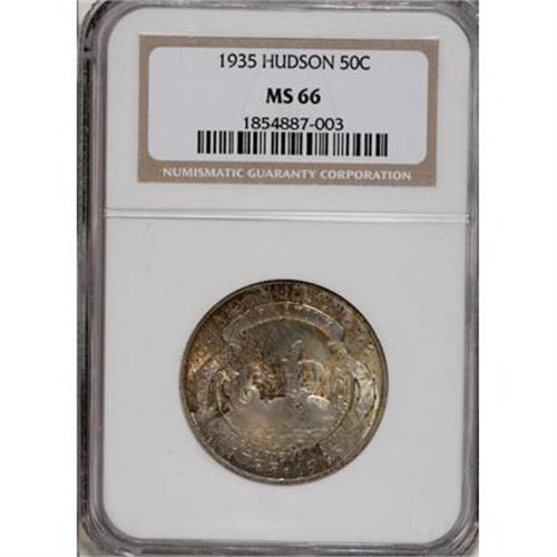 <B>1935 50C Hudson MS66 NGC.</B></I> Splashes of honey-gold, lime-green, lilac, and cherry-red patina embraces this lustrous and nearly mark-free Premium Gem. The centers have a hint of incompleteness, as always for this low mintage type, but the eye appeal is uncontestable. NGC has certified just 25 pieces finer (11/07).<BR><BR><b>Shipping:</b> Coins & Currency (<a target="_blank" href="http://www.heritageauctions.com/common/shipping.php">view shipping information</a>)