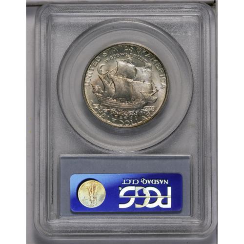 <B>1935<50C> Hudson MS66 PCGS.</B></I> Only 10,000 Hudsons (plus an additional eight reserved for assay) were struck, and the issue was initially offered at $1 apiece. It sold out within days of its release to speculators, who dispersed their hoards at much higher prices. High grade pieces are scarce, since the sails and Poseidon usually acquire abrasions. This lustrous Premium Gem is carefully preserved, however, and features attractive light golden-brown and sky-gray toning.