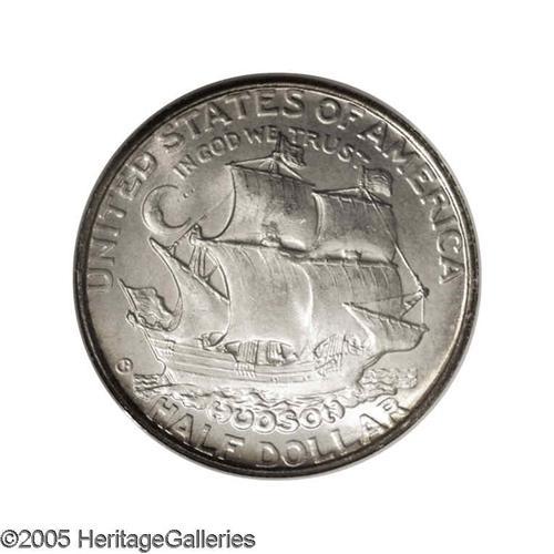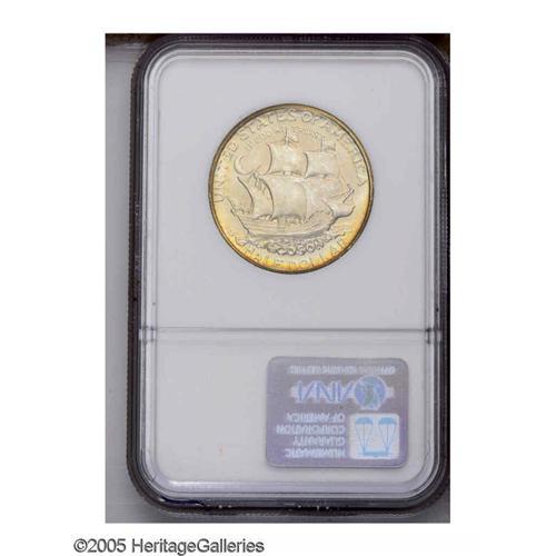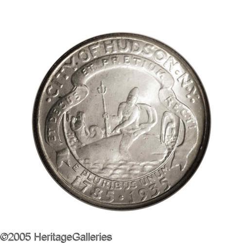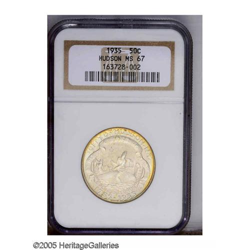 <B>1935<50C> Hudson MS67 NGC.</B></I> Luminous apricot patina hugs the borders, while the centers have pearl-gray color with faint streaks of golden-brown iridescence. A lustrous Superb Gem with a good strike and attractive preservation. The Hudson, Hawaiian, and Spanish Trail types have the lowest mintages in the Silver Commemorative series with 10,008 pieces each, and the Hudson is far scarcer in high grades than is the Spanish Trail. Census: 21 in 67, 0 finer (11/05).<BR><I>From The Clearfield Collection.</B></I>