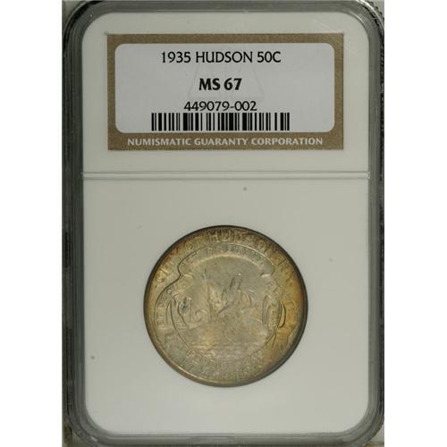 <B>1935 50C Hudson MS67 NGC.</B></I> Rich peach toning is brightest on the obverse. Glimpses of lime and pearl-gray are also evident. Lustrous and remarkably smooth, since the only contact found is on the highpoints, and represents abrasions on the planchet prior to the strike. Census: 25 in 67, 0 finer (11/06).<BR><BR><b>Shipping:</b> Coin/Currency (<a target="_blank" href="http://www.heritageauctions.com/common/shipping.php">view shipping information</a>)