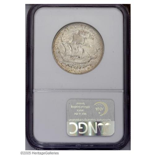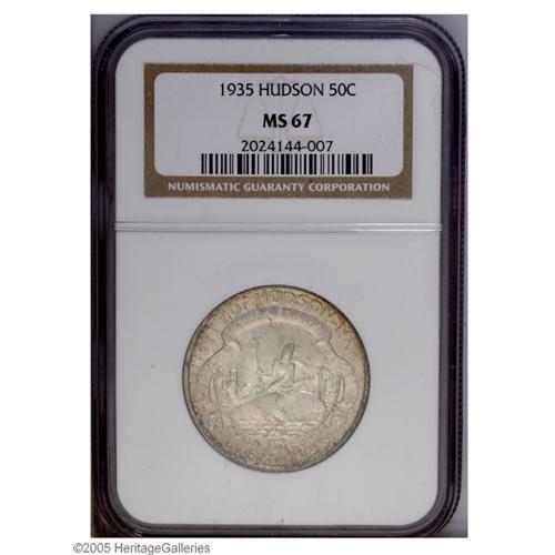 <B>1935<50C> Hudson MS67 NGC.</B></I> Unusually well struck for this normally soft issue, with crisp details throughout, fine satin luster, and attractive speckled patina, mainly near the borders. A wonderfully appealing Superb Gem, and surely one of the finest examples known of this commemorative type. Population: 20 in 67, 0 finer (10/05).