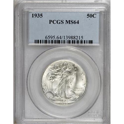 <B>1935 50C MS64 PCGS.</B></I> PCGS Population (933/1280). NGC Census: (638/799). Mintage: 9,162,000. Numismedia Wsl. Price for NGC/PCGS coin in MS64: $100. (#6595)<BR><BR><B>Coin Engraver:</B> Adolph A. Weinman<BR><BR><b>Shipping:</b> Coins & Currency (<a target="_blank" href="http://www.heritageauctions.com/common/shipping.php">view shipping information</a>)