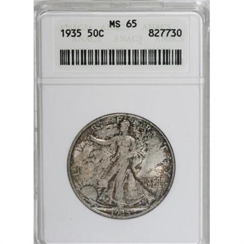 <B>1935 50C MS65 ANACS.</B></I> NGC Census: (593/203). PCGS Population (904/376). Mintage: 9,162,000. Numismedia Wsl. Price for NGC/PCGS coin in MS65: $550. (#6595)<BR><BR><B>Coin Engraver:</B> Adolph A. Weinman<BR><BR><b>Shipping:</b> Coins & Currency (<a target="_blank" href="http://www.heritageauctions.com/common/shipping.php">view shipping information</a>)