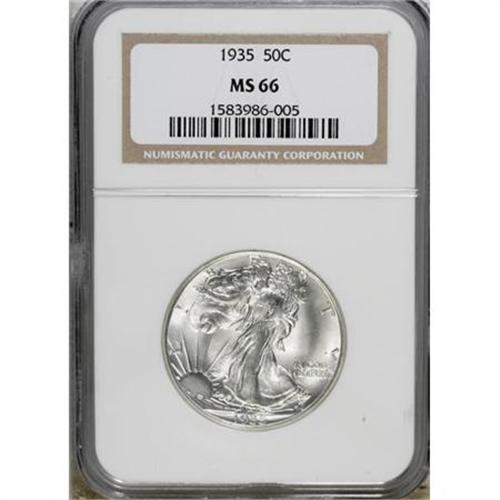 <B>1935 50C MS66 NGC.</B></I> . NGC Census: (203/17). PCGS Population (357/17). Mintage: 9,162,000. Numismedia Wsl. Price for NGC/PCGS coin in MS66: $800. (#6595)<BR><BR><B>Coin Engraver:</B> Adolph A. Weinman<BR><BR><b>Shipping:</b> Coins & Currency (<a target="_blank" href="http://www.heritageauctions.com/common/shipping.php">view shipping information</a>)