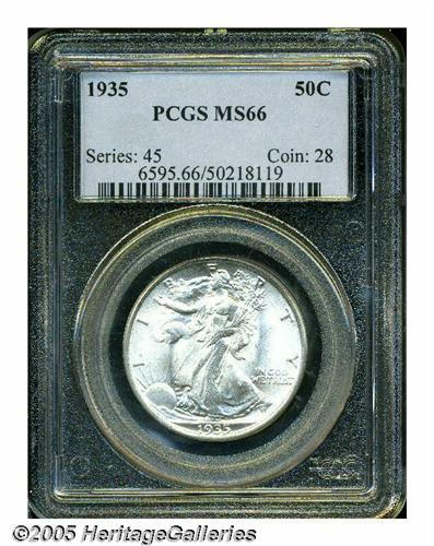 <B>1935<50C> MS66 PCGS.</B></I> Brilliant surfaces display dazzling luster, and are seemingly devoid of significant marks. The design features are sharply impressed. PCGS and NGC combined have certified only 32 pieces finer (5/05).