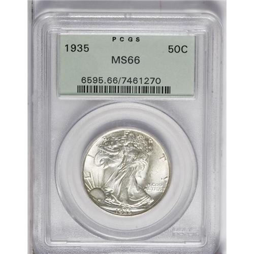 <B>1935<50C> MS66 PCGS.</B></I> Speckled gold toning is evident on each side of this beautiful Gem. The surfaces have soft, frosty luster and full mint brilliance. Slight design weakness is noted at the center of the obverse.<BR><I>From The Big Tex Registry Set of Walking Liberty Halves.</B></I>