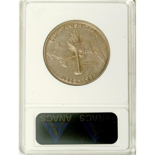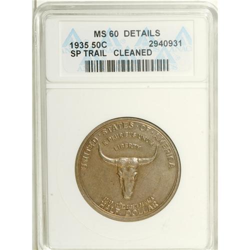 <B>1935 50C Spanish Trail--Cleaned--ANACS. MS60 Details.</B></I> Golden-gray surfaces reveal faint hairlines under high magnification. All of the design elements are well brought up, and both sides are devoid of mentionable marks. Overall, a nice, sharp coin with a light cleaning that should not dissuade interested bidders.<BR><BR><b>Shipping:</b> Coins & Currency (<a target="_blank" href="http://www.heritageauctions.com/common/shipping.php">view shipping information</a>)