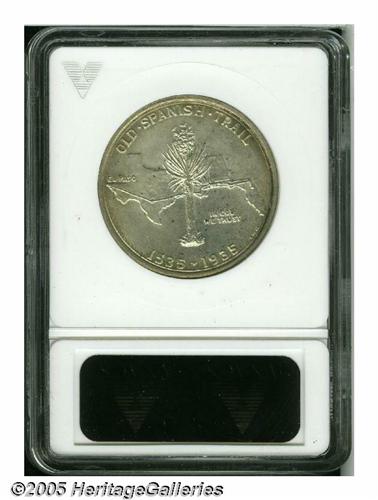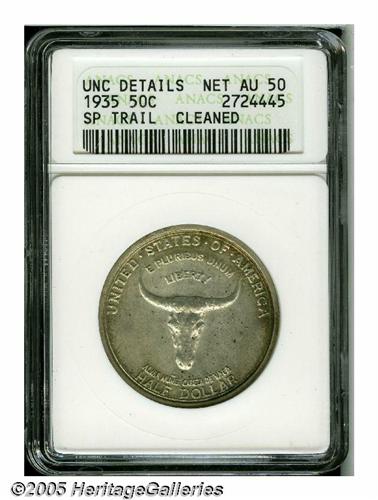 <B>1935<50C> Spanish Trail--Cleaned--ANACS. Unc Details, Net AU50.</B></I> A lightly hairlined example of this tough low mintage type. A few tiny spots are distributed, but the piece has retoned in attractive golden-brown and cream colors.<BR><I>From the Dr. Kurt Peters Collection.</B></I> From the Dr. Kurt Peters Collection.