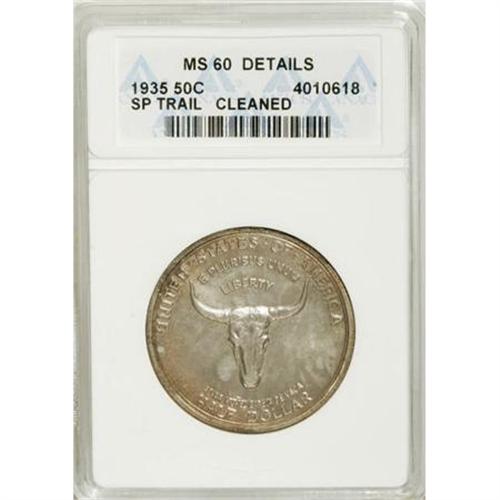 <B>1935 50C Spanish Trail--Cleaned--ANACS. MS60 Details.</B></I> Dappled chestnut-gold toning aids the eye appeal of this subdued Spanish Trail half. No hairlines are evident, although a small strike-through is noted above Florida.<BR><BR><b>Shipping:</b> Coins & Currency (<a target="_blank" href="http://www.heritageauctions.com/common/shipping.php">view shipping information</a>)
