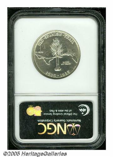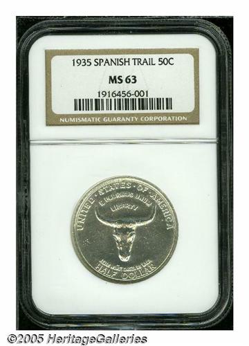 <B>1935<50C> Spanish Trail MS63 NGC.</B></I> Well struck with bright, frosty, silver-white surfaces that reveal a few grade-limiting contact marks in the obverse fields. Highly lustrous and exceptionally attractive, for the grade.