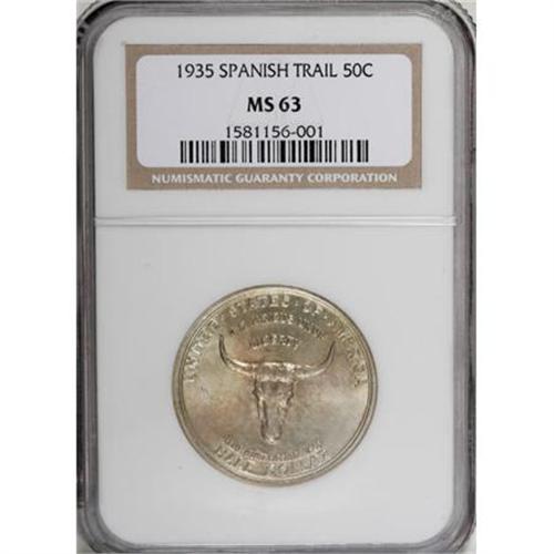 <B>1935 50C Spanish Trail MS63 NGC.</B></I> A vibrant blush of reddish-orange patina dominates the center of the obverse, while the lustrous reverse displays a more even golden tint. Though a few isolated, wispy abrasions are present in the obverse fields, the coin's overall appearance is suggestive of a finer grade.<BR><BR><b>Shipping:</b> Coins & Currency (<a target="_blank" href="http://www.heritageauctions.com/common/shipping.php">view shipping information</a>)