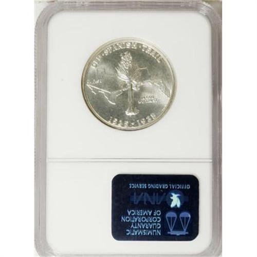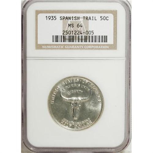 <B>1935 50C Spanish Trail MS64 NGC.</B></I> Mostly brilliant with an intense satiny sheen across the rather expansive fields. Only a few shallow, well scattered field marks on the obverse preclude Gem status.<BR><BR><b>Shipping:</b> Coins & Currency (<a target="_blank" href="http://www.heritageauctions.com/common/shipping.php">view shipping information</a>)