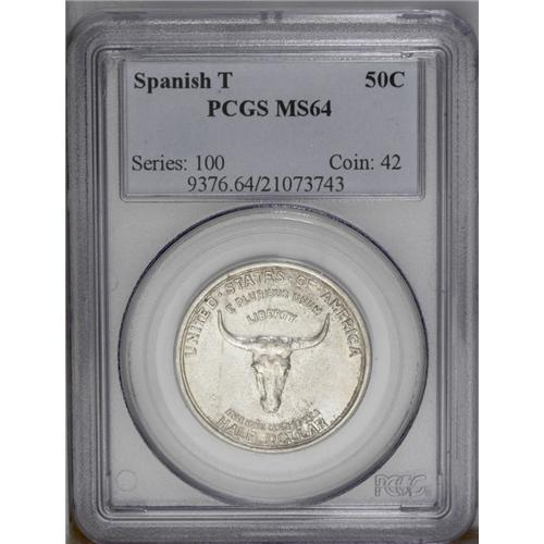 <B>1935 50C Spanish Trail MS64 PCGS.</B></I> Smooth, highly lustrous surfaces really stand out on this popular commemorative. Faint speckles of gray color overrun each side. Sharply struck, with just a few trivial marks that define the grade.