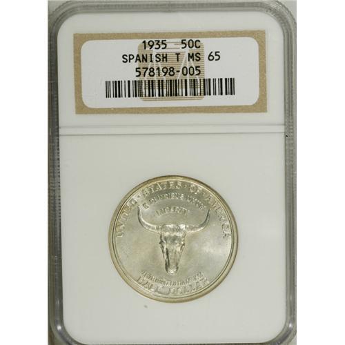 <B>1935 50C Spanish Trail MS65 NGC.</B></I> Bright luster enlivens this Gem commemorative, and is complemented by sharply struck motifs. Well cared for surfaces reveal just a few minor luster grazes.<BR><BR><b>Shipping:</b> Coins & Currency (<a target="_blank" href="http://www.heritageauctions.com/common/shipping.php">view shipping information</a>)