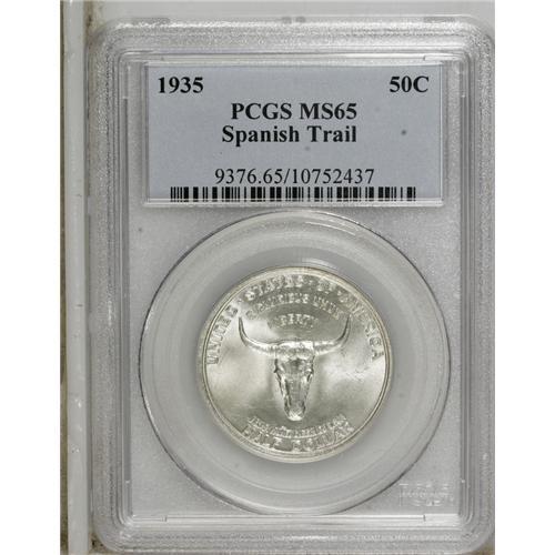 <B>1935 50C Spanish Trail MS65 PCGS.</B></I> An unbelievable brilliant Gem that exhibits crisply impressed motifs. A few trivial marks in the open fields, particularly on the reverse, are not at all detracting. There are probably fewer marks on this lovely commemorative than what would be expected for the grade designation.<BR><BR><b>Shipping:</b> Coins & Currency (<a target="_blank" href="http://www.heritageauctions.com/common/shipping.php">view shipping information</a>)