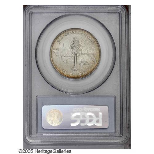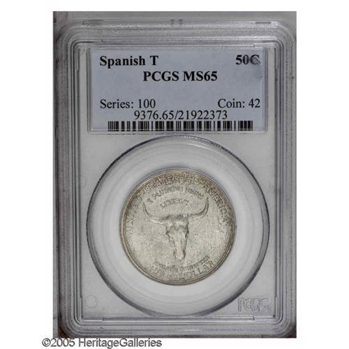 <B>1935<50C> Spanish Trail MS65 PCGS.</B></I> One of the lower mintage issues in the commemorative series, this example shows a modicum of trivial marks in the open fields and original mottled blue-purple toning in the centers with more concentrated amber color along the reverse rims. A spectacular example for the toned coin enthusiast.