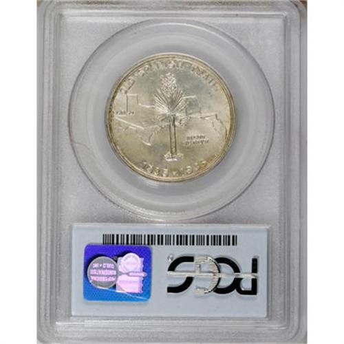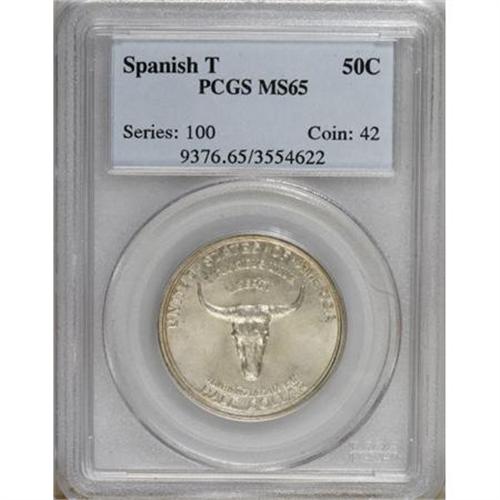 <B>1935 50C Spanish Trail MS65 PCGS.</B></I> Well struck with intense satin luster and smoky silver-gray toning enhanced by slight amounts of speckled russet patina near the reverse periphery. Nearly blemish-free, save for a few small marks on the reverse fields. A popular low mintage issue in the silver commemorative series. <BR><BR><b>Shipping:</b> Coins & Currency (<a target="_blank" href="http://www.heritageauctions.com/common/shipping.php">view shipping information</a>)