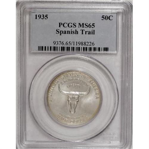 <B>1935 50C Spanish Trail MS65 PCGS.</B></I> Soft, pleasing luster enhances the visual appeal of this Spanish Trail Gem. A well-defined piece that shows only a handful of tiny stray flaws that are entirely consistent with the grade.<BR><I>From The John Stimson, Sr. Collection, Part Two.</B></I><BR><BR><b>Shipping:</b> Coins & Currency (<a target="_blank" href="http://www.heritageauctions.com/common/shipping.php">view shipping information</a>)