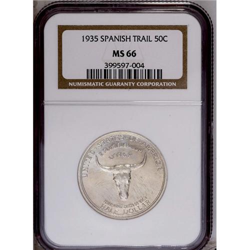 <B>1935<50C> Spanish Trail MS66 NGC.</B></I> Light milky toning shows over surfaces that have escaped all but the most trivial imperfections. A scarce and popular issue.