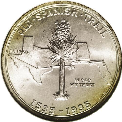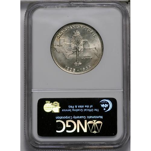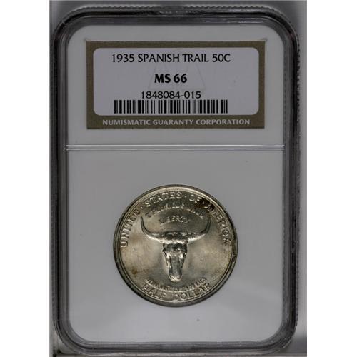 <B>1935<50C> Spanish Trail MS66 NGC.</B></I> Potent luster sweeps pearl-gray surfaces, which also display infrequent autumn-brown freckles. This exactingly struck Premium Gem is attractively preserved, and would be a standout contribution to a silver commemorative type set. Designed and marketed by L.W. Hoffecker, who was later elected ANA President.<BR><I>Ex: Stack's, 4/50, lot 11.</B></I><BR><I>From The Redfjord Collection.</B></I>