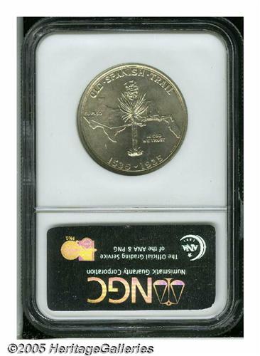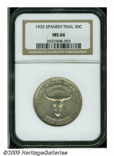 <B>1935<50C> Spanish Trail MS66 NGC.</B></I> The otherwise golden tinting deepens a little to orange hues in several areas at or near the borders. Both sides are fully frosted in finish with nary a distracting blemish to report. A challenging issue to locate as a Gem, the Spanish Trail Commemorative is decidedly rare in grades above the MS66 level.