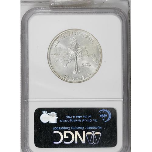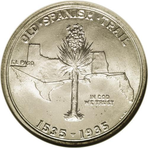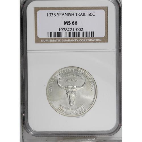 <B>1935<50C> Spanish Trail MS66 NGC.</B></I> Tied with the Hudson as having the lowest mintage among post-1928 commemoratives, true Gems are very elusive of this issue, primarily because of the large, open areas on each side. This piece is as free from most abrasions and the surfaces are satiny and essentially untoned throughout. This piece is quite a radical departure from the nicked, gray, and dull examples usually encountered.