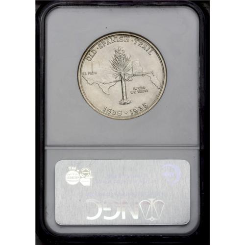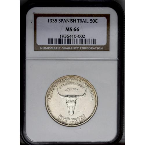 <B>1935<50C> Spanish Trail MS66 NGC.</B></I> Typically well struck with a pleasing, bright satiny sheen, a faint degree of golden-brown peripheral toning on the obverse, and impressively preserved surfaces that only show a few tiny marks on the large open fields. A visually alluring Premium Gem. <BR><BR><B>Important notice:</B> Heritage usually auctions material at the rate of 200-250 lots per hour. On some occasions eBay Live bid software or the Internet may not be able to keep up with the pace of the auction. We recommend placing a realistic absentee bid now as insurance to avoid disappointment. Occasionally the auctioneer may eliminate or reject an eBay Live bid, and the auctioneer may also reopen a lot after the close of the eBay live bidding (usually because we missed an audience bid), and may reject your bid even if it shows you as the winning bidder. By bidding via eBay Live, you agree that Heritage may award the lot to another bidder at its sole discretion under the circumstances described above or any other reasonable circumstances. Since eBay bids are not shown to us until we open the lot on the floor, we treat those bids just like floor bids. In most cases the floor responds before the eBay bid is presented to us, due to Internet lag time, so for consistency we have made it a policy that floor bids are always considered first over tie eBay live bids. Also please note that all Heritage lots purchased through eBay Live carry a 20% Buyer's Premium. Please make sure you read the Terms and Conditions before you bid. This lot is being auctioned in conjunction with a live floor auction by Heritage Galleries & Auctioneers. All final auction and invoice information will be supplied by Heritage Galleries & Auctioneers, and all other information should be considered preliminary. Lot:5085 <BR><BR><B>Winning Notification and Billing:</B> After the FINAL session in this auction is complete, Heritage will send e-mail and snail mail invoices. This process normally takes several days. All final auction and invoice information will be supplied by Heritage Galleries & Auctioneers, and all other information should be considered preliminary. <BR><BR>This auction will be conducted on a live auction floor and over the Internet through eBay Live. If you choose to place an absentee bid, please take a moment to <font color='#0000ff'><u><a href='http://pages.ebay.com/liveauctions/help/before/laabsentee.html'>learn how eBay Live absentee bidding works</a></u></font><font color='#000000'>