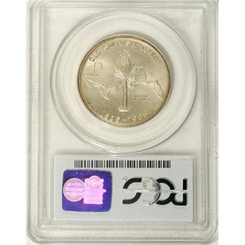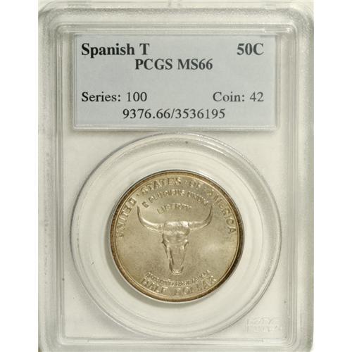 <B>1935 50C Spanish Trail MS66 PCGS.</B></I> Glowing luster exudes from beneath a thin layer of light tan-gold color, and the design elements have been strongly impressed by a well-executed strike. This marvelous commemorative would likely grade even higher were it not for a mark or two in the fields of each side.<BR><BR><b>Shipping:</b> Coins & Currency (<a target="_blank" href="http://www.heritageauctions.com/common/shipping.php">view shipping information</a>)