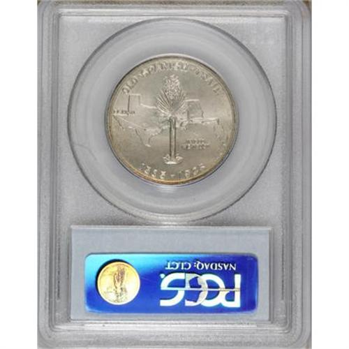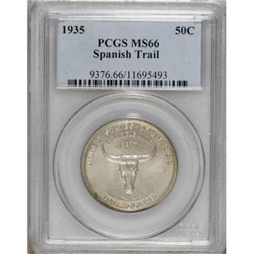 <B>1935 50C Spanish Trail MS66 PCGS.</B></I> In one of the more egregious incidents of the scandal-ridden history of commemoratives, the entire Spanish Trail mintage was delivered to a single dealer-speculator, L.W. Hoffecker. Subtly lustrous with delicate pastel blue and yellow colors over the carefully preserved surfaces. A single thin mark is noted below Alabama on the reverse.<BR><BR><b>Shipping:</b> Coins & Currency (<a target="_blank" href="http://www.heritageauctions.com/common/shipping.php">view shipping information</a>)