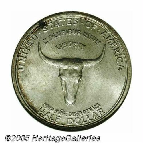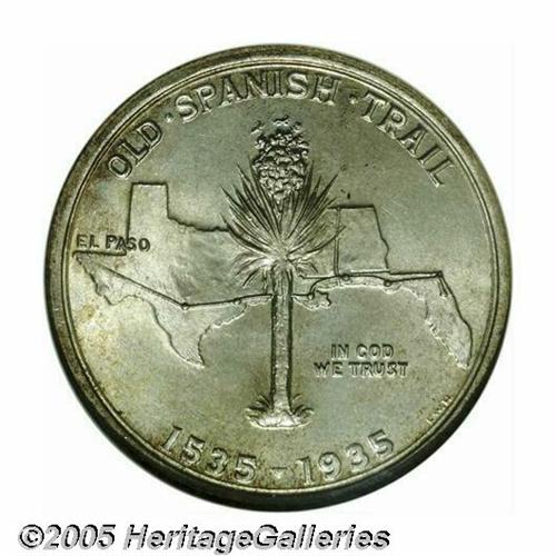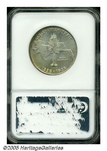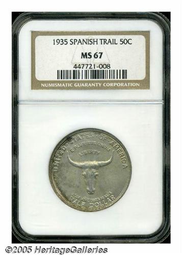 <B>1935<50C> Spanish Trail MS67 NGC.</B></I> Because of the large, open spaces on each side of this coin there are no convenient places for abrasions to hide. This particular coin is as close to technical perfection as any Spanish Trail we have seen in recent memory. There are just no singular marks that draw the attention of the viewer. The only mentionable ripple in the texture of the surface is a darker spot of toning (not carbon!) above the first S in STATES on the obverse. Otherwise, the surfaces are light gray-golden with strong underlying satiny mint luster. Population: 54 in 67, 3 finer (4/05).