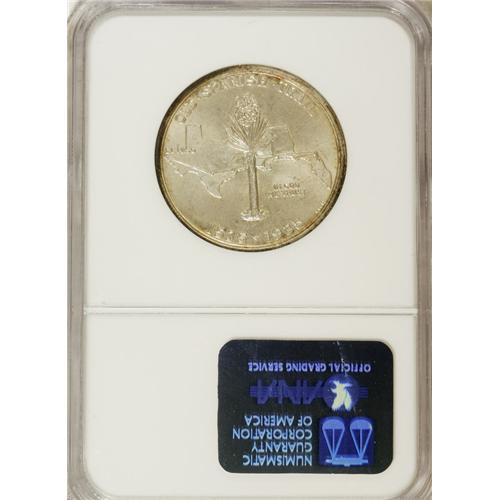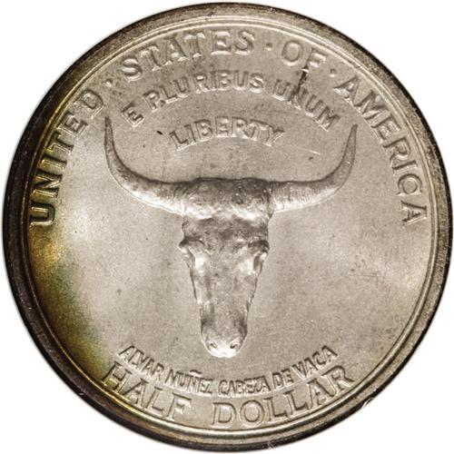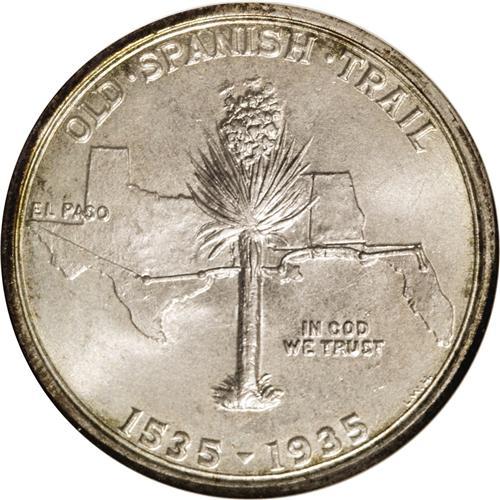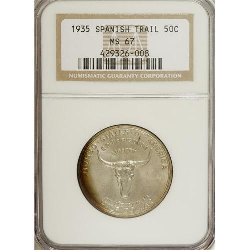 <B>1935 50C Spanish Trail MS67 NGC.</B></I> Rather than placing yet another fanciful portrait on a commemorative, L.W. Hoffecker, designer and distributor of the Spanish Trail commemorative, opted for the head of a cow. While a faithful translation of the name of the trekker who made the route famous, the overall effect left something to be desired. Light golden-gray patina covers most of this unusually well-preserved Spanish Trail half. A sliver of deep orange graces the left obverse, while similar color just touches the rim at the corresponding place on the satiny reverse. A carefully preserved representative of this low-mintage issue. NGC recognizes just three coins in MS68 and only one in MS68 <img border='0' src='http://www.heritagecoins.com/images/star.gif' width=10 height=10> (3/07).<BR><I>From The Cary & Cheryl Porter Collection.</B></I><BR><BR><b>Shipping:</b> Coins & Currency (<a target="_blank" href="http://www.heritageauctions.com/common/shipping.php">view shipping information</a>)