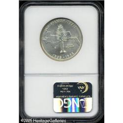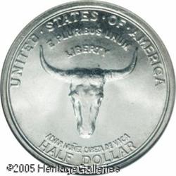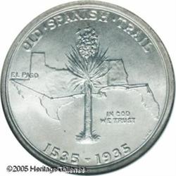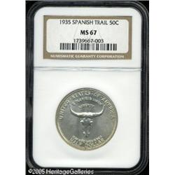 <B>1935 50C Spanish Trail MS67 NGC.</B></I> Satin luster rolls unencumbered across the nearly immaculate surfaces. A needle-sharp example that is untoned aside from faint honey-gray color. The Spanish Trail has one of the lowest mintages of any Commemorative type, and has long been regarded as a key to the series. Rare in higher certified grades, since the open fields are unforgiving of coin to coin contact. Population: 52 in 67, 2 finer (1/05).<BR><I>From The Banks Collection.</B></I> Lot:8586