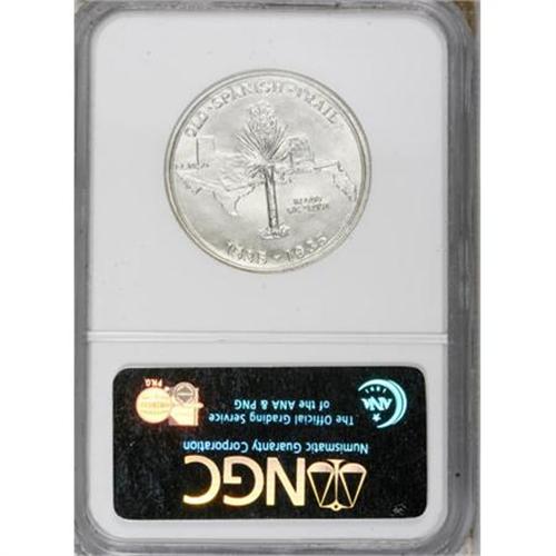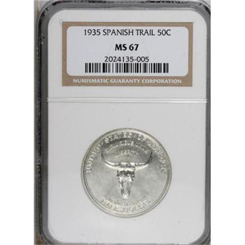 <B>1935 50C Spanish Trail MS67 NGC.</B></I> The Spanish Trail half, one of the seedier commemorative issues of the classic era, had a deliberately limited mintage and all examples went to L.W. Hoffecker, the designer and a dealer with questionable motives. The luminous, minimally toned surfaces of this well-defined example are surprisingly mark-free. Finding a numerically superior piece is exceedingly difficult; NGC has graded just five such coins (9/07).<BR><BR><b>Shipping:</b> Coins & Currency (<a target="_blank" href="http://www.heritageauctions.com/common/shipping.php">view shipping information</a>)