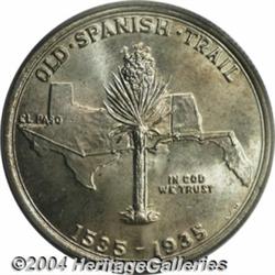 <B>1935<50C> Spanish Trail MS67 PCGS.</B></I> Even though the route traced on the reverse of the Spanish Trail has nothing to do with the actual trail known by that name, it has not stopped from collectors over the past sixty years from appreciating this attractively designed commemorative half. The large, open fields are especially susceptible to abrasions. On this piece the only noticeable marks are a couple of small ones on the reverse above and below the motto. Lightly toned on each side. Population: 77 in 67, 1 finer (3/04).<BR><I>From The Del Rio Collection, Part One.</B></I> <BR><BR><B>Important notice:</B> Heritage usually auctions material at the rate of 200-250 lots per hour. On some occasions eBay Live bid software or the Internet may not be able to keep up with the pace of the auction. We recommend placing a realistic absentee bid now as insurance to avoid disappointment. Occasionally the auctioneer may eliminate or reject an eBay Live bid, and the auctioneer may also reopen a lot after the close of the eBay live bidding (usually because we missed an audience bid), and may reject your bid even if it shows you as the winning bidder. By bidding via eBay Live, you agree that Heritage may award the lot to another bidder at its sole discretion under the circumstances described above or any other reasonable circumstances. Since eBay bids are not shown to us until we open the lot on the floor, we treat those bids just like floor bids. In most cases the floor responds before the eBay bid is presented to us, due to Internet lag time, so for consistency we have made it a policy that floor bids are always considered first over tie eBay live bids. Also please note that all Heritage lots purchased through eBay Live carry a 20% Buyer's Premium. Please make sure you read the Terms and Conditions before you bid. </span></font></tr></table></td></tr></table>