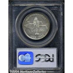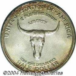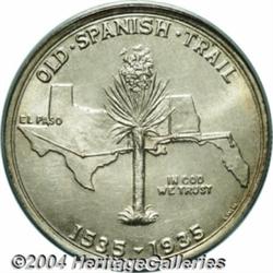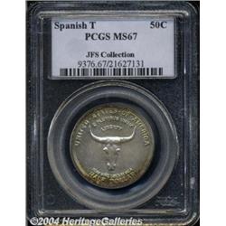 <B>1935<50C> Spanish Trail MS67 PCGS.</B></I> Rich golden-brown, rose, and forest-green patina enriches the borders of this satiny Superb Gem. Meticulously struck, and essentially flawless aside from a solitary fleck of PVC residue beneath the left (facing) horn. The Spanish Trail Commemorative was designed by L.W. Hoffecker, who was later elected President of the American Numismatic Association. Only 10,008 pieces were struck, a production similar to that of the more costly Hawaiian type. Population: 79 in 67, 1 finer (6/04).<BR><I>From the JFS Collection, the #1 All-Time PCGS Registry Set.</B></I> <BR><BR><B>Important notice:</B> Heritage usually auctions material at the rate of 200-250 lots per hour. On some occasions eBay Live bid software or the Internet may not be able to keep up with the pace of the auction. We recommend placing a realistic absentee bid now as insurance to avoid disappointment. Occasionally the auctioneer may eliminate or reject an eBay Live bid, and the auctioneer may also reopen a lot after the close of the eBay live bidding (usually because we missed an audience bid), and may reject your bid even if it shows you as the winning bidder. By bidding via eBay Live, you agree that Heritage may award the lot to another bidder at its sole discretion under the circumstances described above or any other reasonable circumstances. Since eBay bids are not shown to us until we open the lot on the floor, we treat those bids just like floor bids. In most cases the floor responds before the eBay bid is presented to us, due to Internet lag time, so for consistency we have made it a policy that floor bids are always considered first over tie eBay live bids. Also please note that all Heritage lots purchased through eBay Live carry a 20% Buyer's Premium. Please make sure you read the Terms and Conditions before you bid. </span></font></tr></table></td></tr></table>