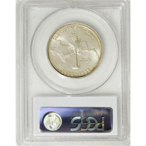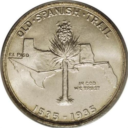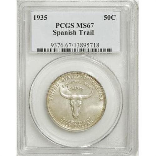 <B>1935 50C Spanish Trail MS67 PCGS.</B></I> Edmund J. Senn, the artist who modeled the Spanish Trail half, is best known as having been unemployed at the time L.W. Hoffecker gave him the commission. Classically trained and Austrian-born, the sexagenarian Senn died in 1938, just three years after his brush with the commemorative world. This silver-gray Superb Gem has subtle pink accents and a touch of orange patina at the rims. Well-defined and carefully preserved with a single spot of deeper toning above the L of LIBERTY. PCGS has graded just two coins finer (6/07).<BR><I>From The Frank DuVall Collection of U.S. Commemoratives.</B></I><BR><BR><b>Shipping:</b> Coins & Currency (<a target="_blank" href="http://www.heritageauctions.com/common/shipping.php">view shipping information</a>)
