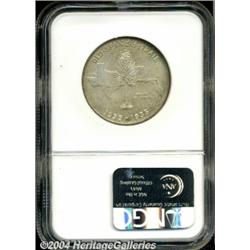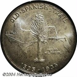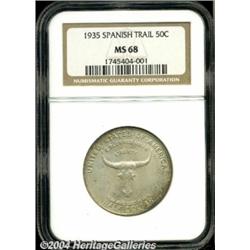 <B>1935<50C> Spanish Trail MS68 NGC.</B></I> This satiny Superb Gem is gorgeously preserved and has a bold strike. Each side displays a coating of medium gray patina with a little darker color about the borders, and there are no blemishes or distractions to be seen. Future ANA President L.W. Hoffecker designed the Spanish Trail, and also assisted in its distribution. Tied with one other example at PCGS at the MS68 level, this is the finest certified Spanish Trail we have handled and it should prove to be a prize for the specialist. <BR><BR><B>Important notice:</B> Heritage usually auctions material at the rate of 200-250 lots per hour. On some occasions eBay Live bid software or the Internet may not be able to keep up with the pace of the auction. We recommend placing a realistic absentee bid now as insurance to avoid disappointment. Occasionally the auctioneer may eliminate or reject an eBay Live bid, and the auctioneer may also reopen a lot after the close of the eBay live bidding (usually because we missed an audience bid), and may reject your bid even if it shows you as the winning bidder. By bidding via eBay Live, you agree that Heritage may award the lot to another bidder at its sole discretion under the circumstances described above or any other reasonable circumstances. Since eBay bids are not shown to us until we open the lot on the floor, we treat those bids just like floor bids. In most cases the floor responds before the eBay bid is presented to us, due to Internet lag time, so for consistency we have made it a policy that floor bids are always considered first over tie eBay live bids. Also please note that all Heritage lots purchased through eBay Live carry a 20% Buyer's Premium. Please make sure you read the Terms and Conditions before you bid. </span></font></tr></table></td></tr></table>