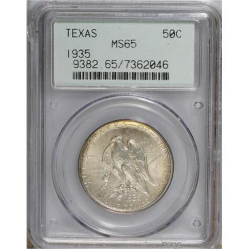 <B>1935 50C Texas MS65 PCGS.</B></I> PCGS Population (721/908). NGC Census: (404/820). Mintage: 9,996. Numismedia Wsl. Price for NGC/PCGS coin in MS65: $292. (#9382)<BR><BR><b>Shipping:</b> Coins & Currency (<a target="_blank" href="http://www.heritageauctions.com/common/shipping.php">view shipping information</a>\)