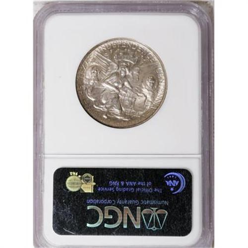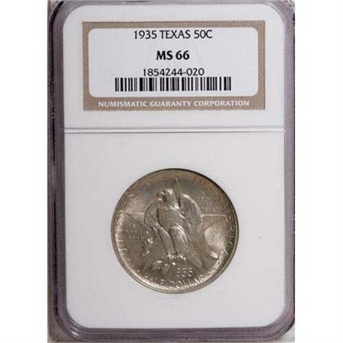 <B>1935 50C Texas MS66 NGC.</B></I> Included with the lot is an aluminum Texas Centennial Exposition plaque, copywrited by Brewer Chicago. The plaque grades VF. NGC Census: (562/258). PCGS Population (707/201). Mintage: 9,996. Numismedia Wsl. Price for NGC/PCGS coin in MS66: $380. (#9382)<BR><I>From The Frank DuVall Collection of U.S. Commemoratives.</B></I><BR><BR><b>Shipping:</b> Coins & Currency (<a target="_blank" href="http://www.heritageauctions.com/common/shipping.php">view shipping information</a>\)