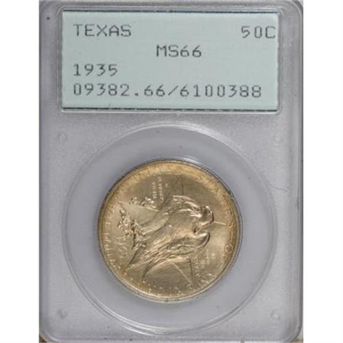 <B>1935 50C Texas MS66 PCGS.</B></I> PCGS Population (716/202). NGC Census: (567/258). Mintage: 9,996. Numismedia Wsl. Price for NGC/PCGS coin in MS66: $380. (#9382)<BR><BR><b>Shipping:</b> Coins & Currency (<a target="_blank" href="http://www.heritageauctions.com/common/shipping.php">view shipping information</a>)