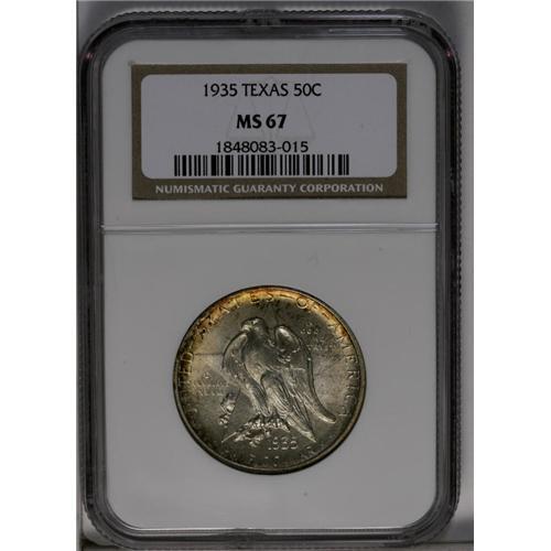 <B>1935<50C> Texas MS67 NGC.</B></I> The obverse's tan rim toning is mirrored by cherry toning on the reverse. The luster is pleasing, though the strike is somewhat soft on the eagle.<BR><I>Ex: John L. Harris Collection (Stack's, 10/50), lot 578.</B></I><BR><I>From The Redfjord Collection.</B></I>