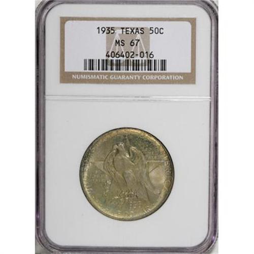 <B>1935 50C Texas MS67 NGC.</B></I> NGC Census: (245/11). PCGS Population (196/5). Mintage: 9,996. Numismedia Wsl. Price for NGC/PCGS coin in MS67: $600. (#9382)<BR><BR><b>Shipping:</b> Coins & Currency (<a target="_blank" href="http://www.heritageauctions.com/common/shipping.php">view shipping information</a>\)