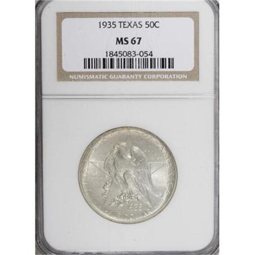<B>1935 50C Texas MS67 NGC.</B></I> NGC Census: (251/11). PCGS Population (198/5). Mintage: 9,996. Numismedia Wsl. Price for NGC/PCGS coin in MS67: $600. (#9382)<BR><BR><b>Shipping:</b> Coins & Currency (<a target="_blank" href="http://www.heritageauctions.com/common/shipping.php">view shipping information</a>)
